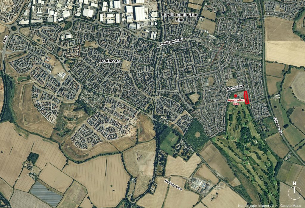 The site is located to the south of Leamington Spa in an area with primarily residential use (see plan above, site highlighted in red). The centre of Leamington Spa lies just over 2.5km to the north. The site is at the north edge of the Leamington and County golf course, beyond which is open countryside.
